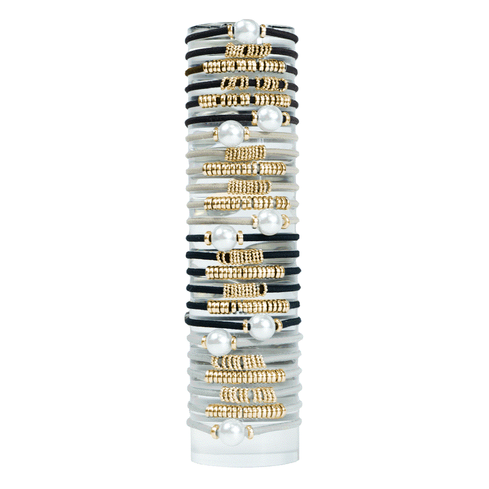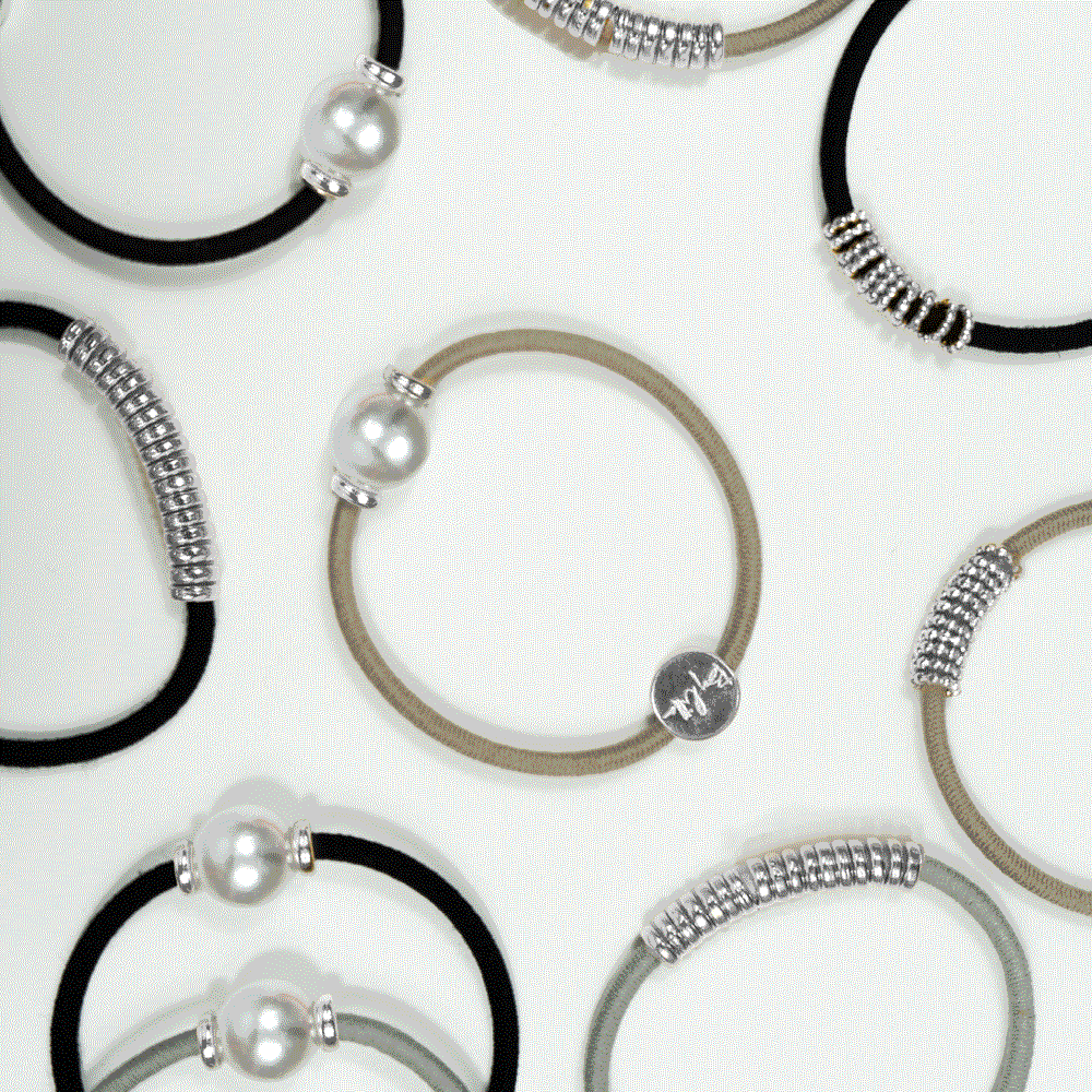 Our Assorted style includes a complete assortment of all our embellishments in one. Wear them as bracelets and when you need a hair tie...just grab one from your stack!