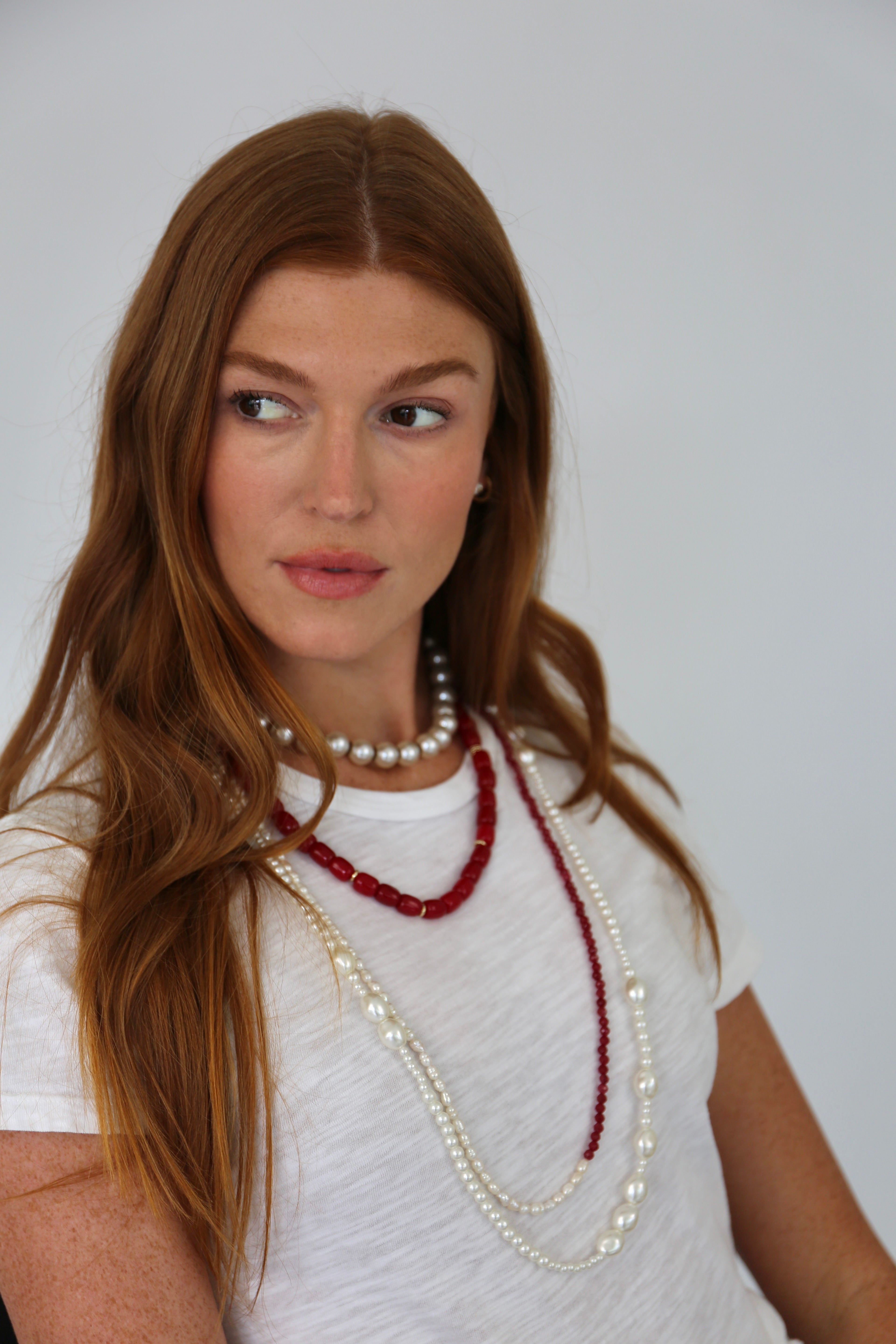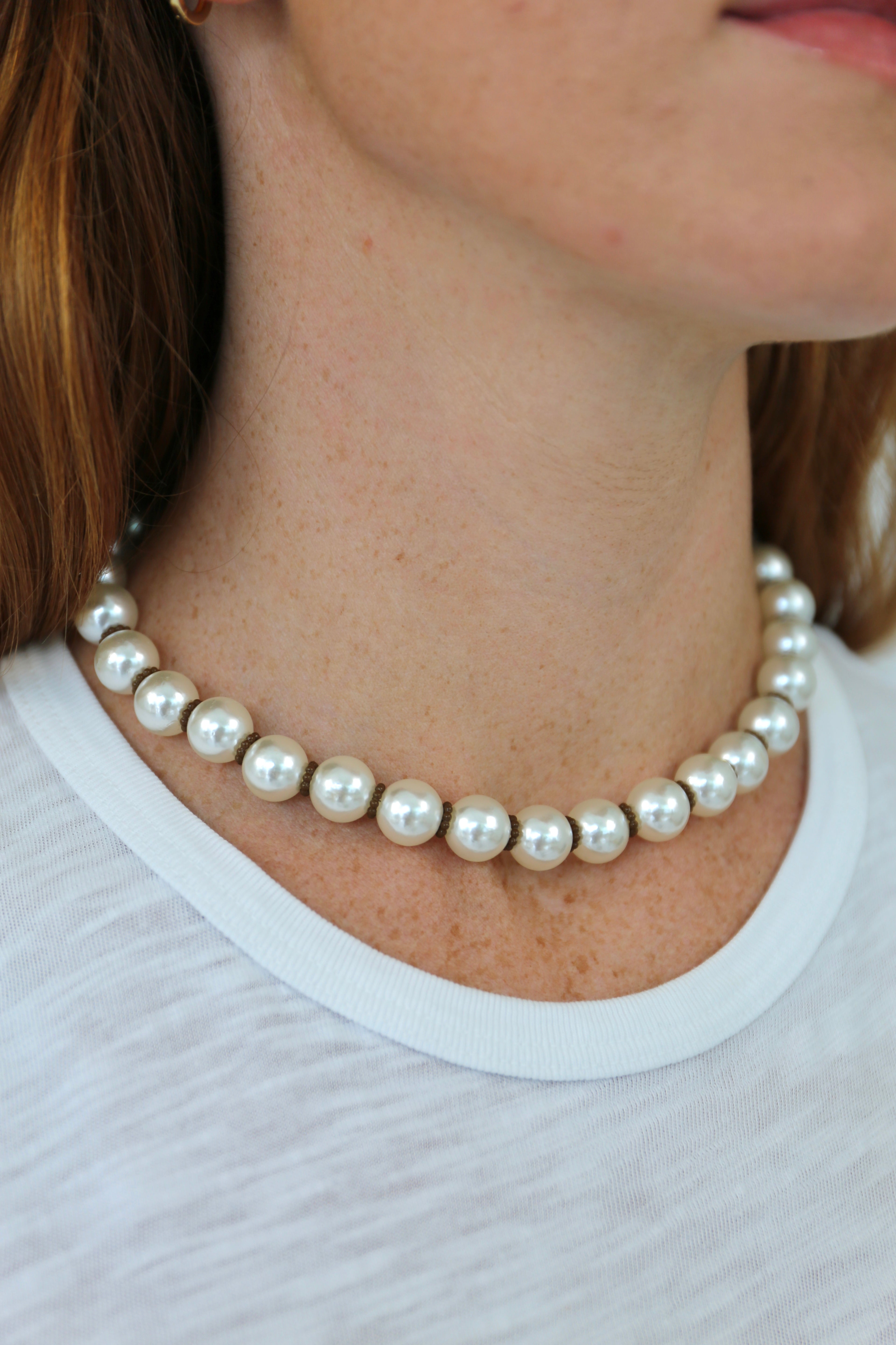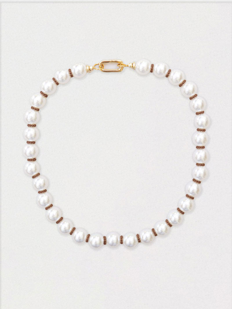 The Audrey necklace combines classic elegance with subtle modern details, featuring lustrous pearls accented by delicate light brown floret rings and refined gold-plated hardware. Inspired by Audrey Hepburn’s timeless style, this piece offers a sophisticated accessory that enhances any outfit with enduring grace and understated charm. Perfect for those seeking a blend of tradition and contemporary design in their jewelry collection. 16" necklace