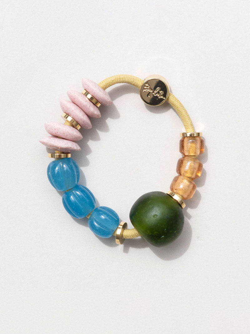The Canal Street bracelet from our Capsule collection is a versatile accessory handcrafted in Colombia. Featuring a unique blend of glass, bone, and wood beads accented with gold plated beads, it serves both as a stylish bracelet and a functional hair tie. Each piece is made in limited quantities, ensuring exclusivity and exceptional craftsmanship. Perfect for those seeking a distinctive, elegant touch with practical use.