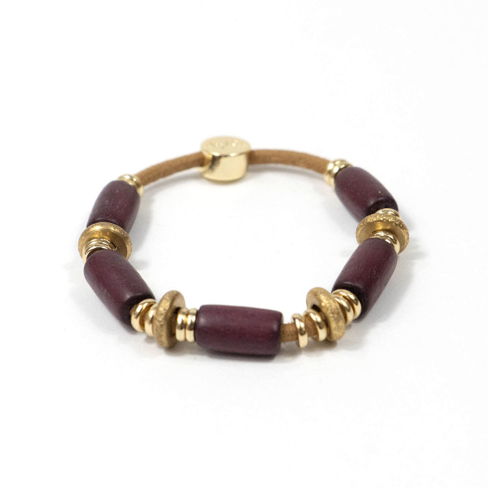 Expertly crafted with burgundy and gold beads, this versatile accessory transitions seamlessly from bracelet to hair tie. The organic wooden beads and neutral bands create a sophisticated aesthetic, while gold accents add a touch of elegance. Each piece features the signature By Lilla charm, combining functionality with elevated style for the modern accessory collection.