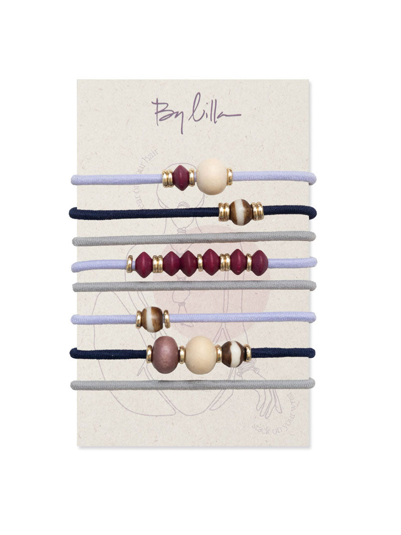 Inspired by Chelsea, NY, this 8-pack of bracelets combines functionality and style with cool tones like navy, lilac, and burgundy. Each bracelet features elegant wooden beads and gold accents, doubling as secure hair ties. Designed for versatility, they offer a chic way to accessorize your wrist while keeping your hair neatly styled.