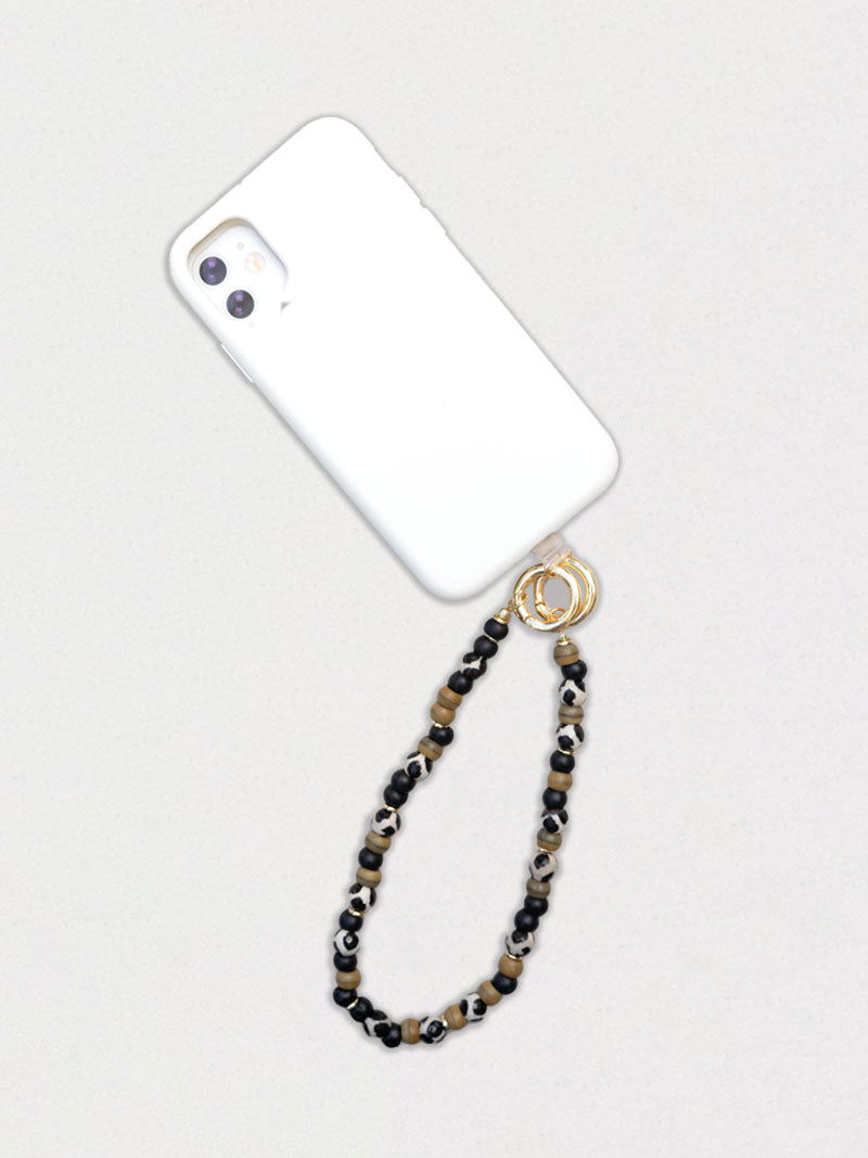 The Cobblestone bag charm is a versatile accessory that doubles as a phone wristlet, combining practicality with style. Expertly handcrafted, it features matte beads made from natural wood, glass and complemented by elegant gold-plated accents. This unique design adds a refined touch to your bag while providing convenient carry options for your phone.