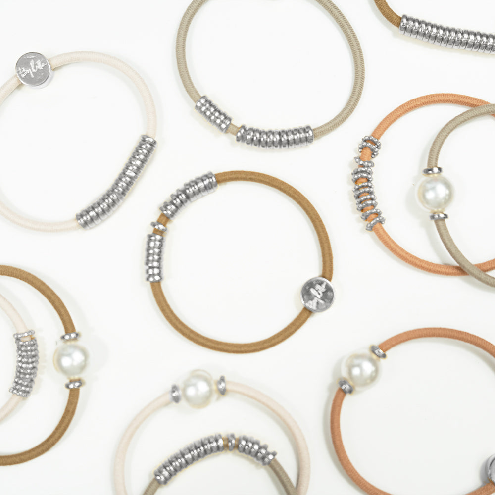 Our Assorted style includes a complete assortment of all our embellishments in one. They can be worn as bracelets and hair ties.