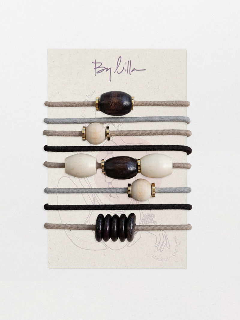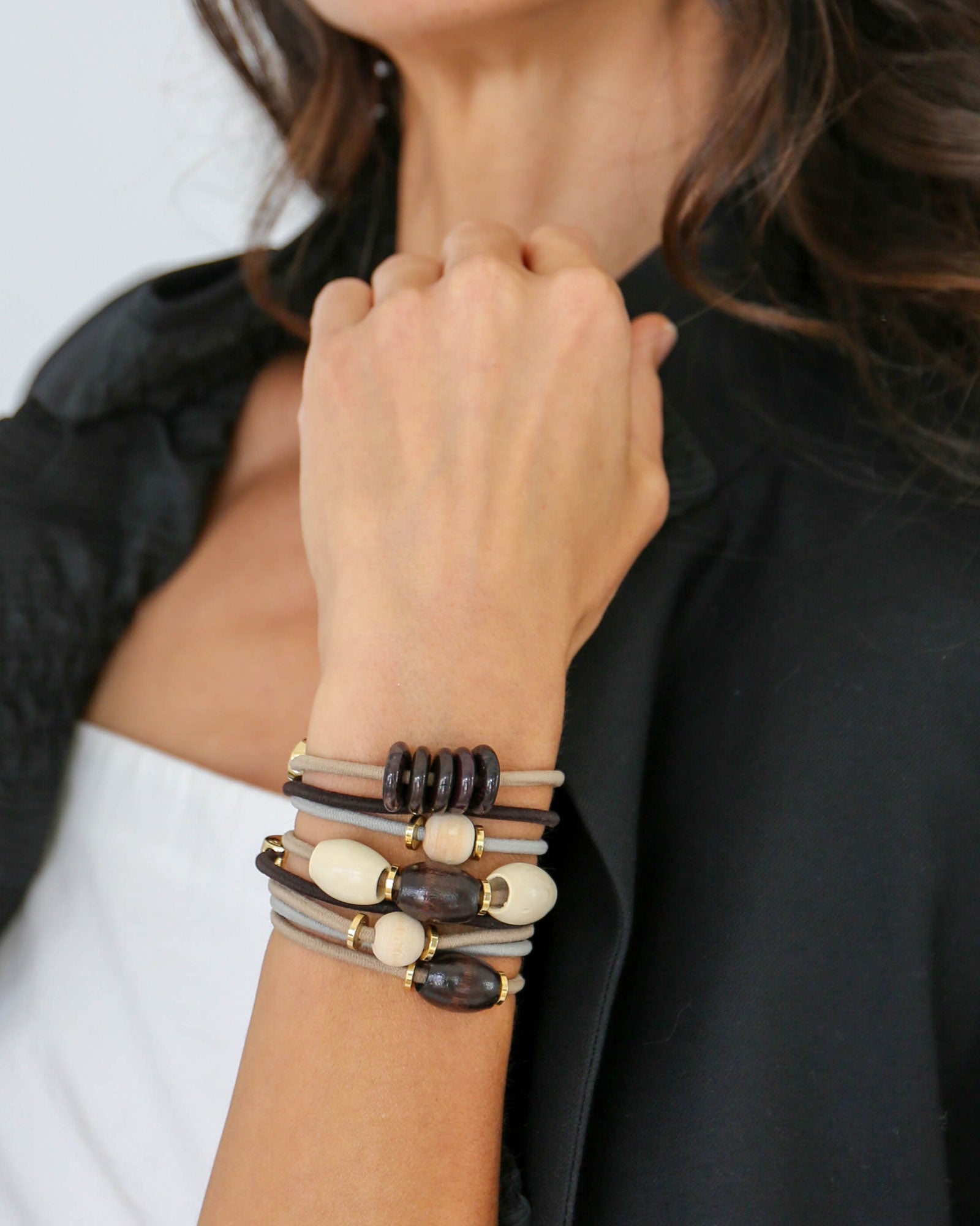 This curated set of eight bracelet–hair ties blends smooth wood and bone beads with polished gold accents on soft neutral elastics—think sandy shores, driftwood tones, and the calming palette of a beach morning. With a mix of sculptural shapes and clean lines, each piece adds a relaxed yet refined touch to your everyday stack.