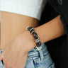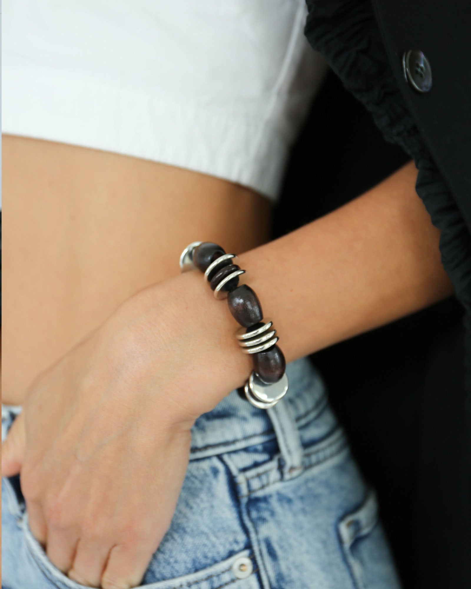 Hand-strung with rich dark wood beads accented by glossy black discs and polished silver rings, this piece brings a modern, sculptural edge to your everyday stack. Set on a sleek black elastic and finished with our signature charm, it strikes the perfect balance between natural texture and refined shine.