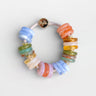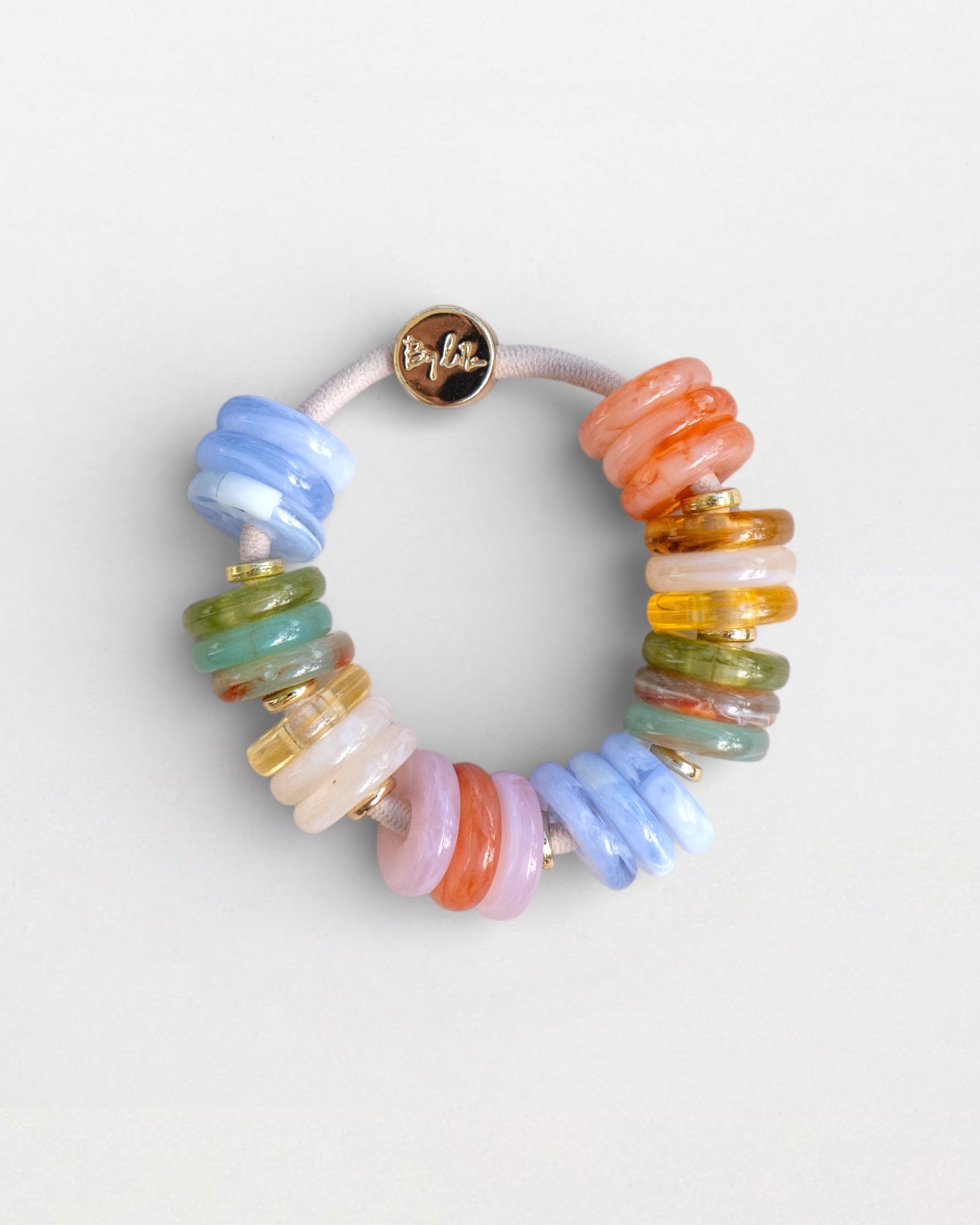 Hand-strung with glossy resin discs in a lively mix of soft pastels and sunlit brights, this piece feels like a celebration in accessory form. The layered beads create a sculptural, rhythmic silhouette, while polished gold accents add a refined touch that keeps the look elevated and wearable.