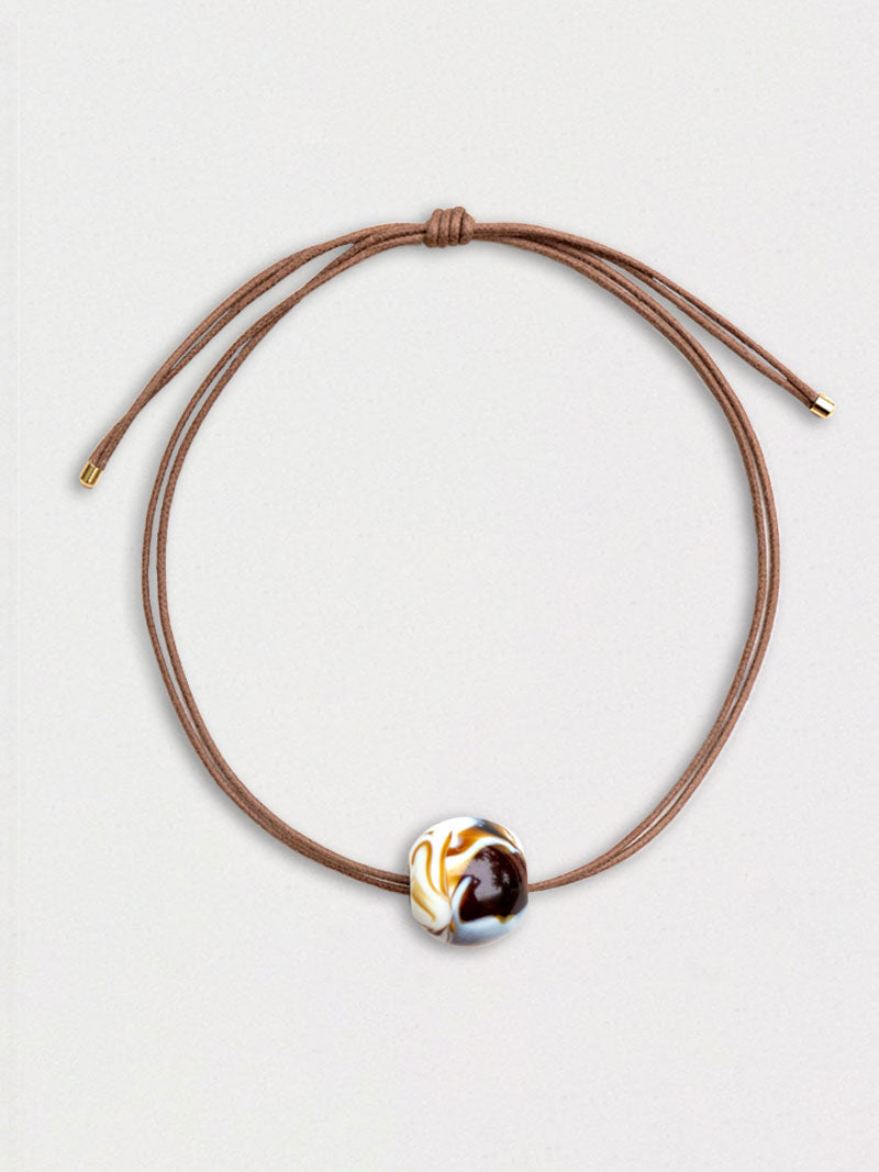 The Ipanema Necklace consists of a round beautiful marble print pendant on a brown cord with gold accents. It offers adjustable sizing to wear it your way.