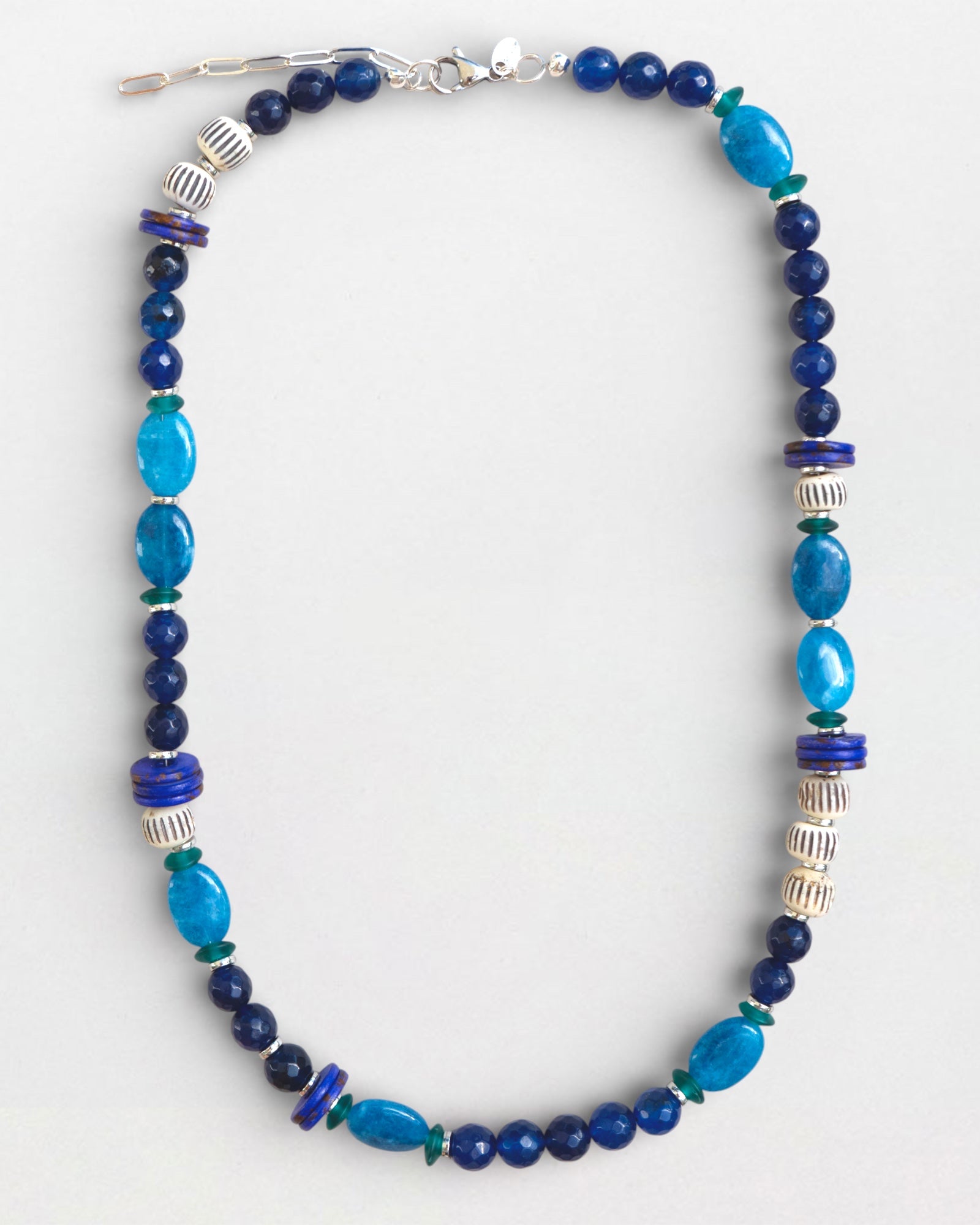 Handcrafted with a thoughtful combination of bone beads, natural Malaysia jade, recycled glass, and smooth white jade, this piece highlights the richness of organic materials and artisan craftsmanship.