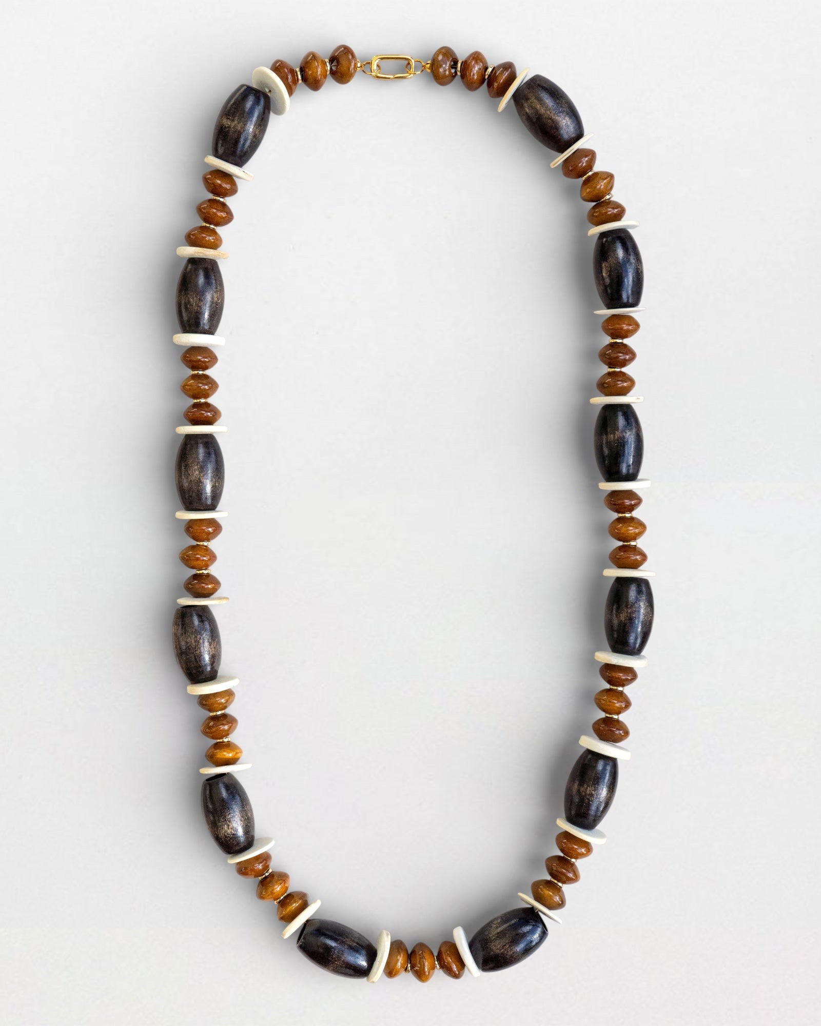 Measuring 34 inches, this long, textural piece channels the soft neutrals and sunbaked tones of the Mojave desert. Its rhythmic mix of creamy beads and deep brown accents creates an organic, grounded silhouette, while subtle gold touches add a hint of refined glow. The extended length gives it beautiful movement and endless styling versatility.