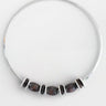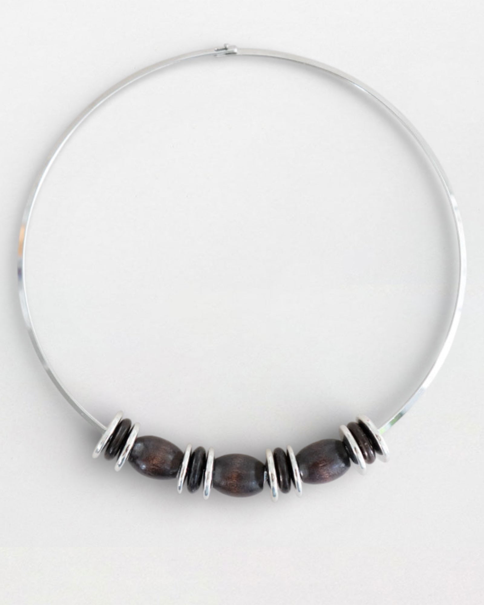 Designed on a polished open-wire collar, this piece features deep, dark wooden beads framed by glossy black and silver accents—creating a striking contrast that feels both minimal and bold. Its clean, sculptural silhouette channels the allure of summer nights by the water, where everything glows a little softer and moves a little slower.