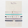 This four-piece bracelet–hair tie set features luminous pearl-inspired beads framed with polished gold accents on soft, sunwashed elastics in sand, seafoam, lavender, and classic navy. Clean, elegant, and subtly coastal, each piece adds a touch of breezy sophistication to your everyday look.