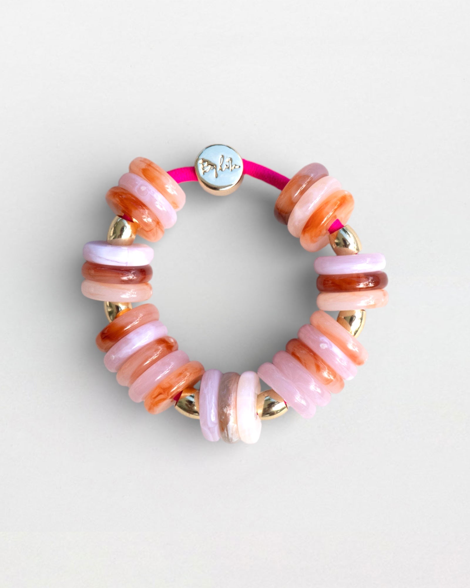 Hand-strung with glossy resin discs in soft blush, warm coral, and delicate lilac tones, this piece captures the lush, full beauty of peonies in bloom. Polished gold accents add a touch of glow, while the bright elastic base keeps the look playful, modern, and easy to wear.