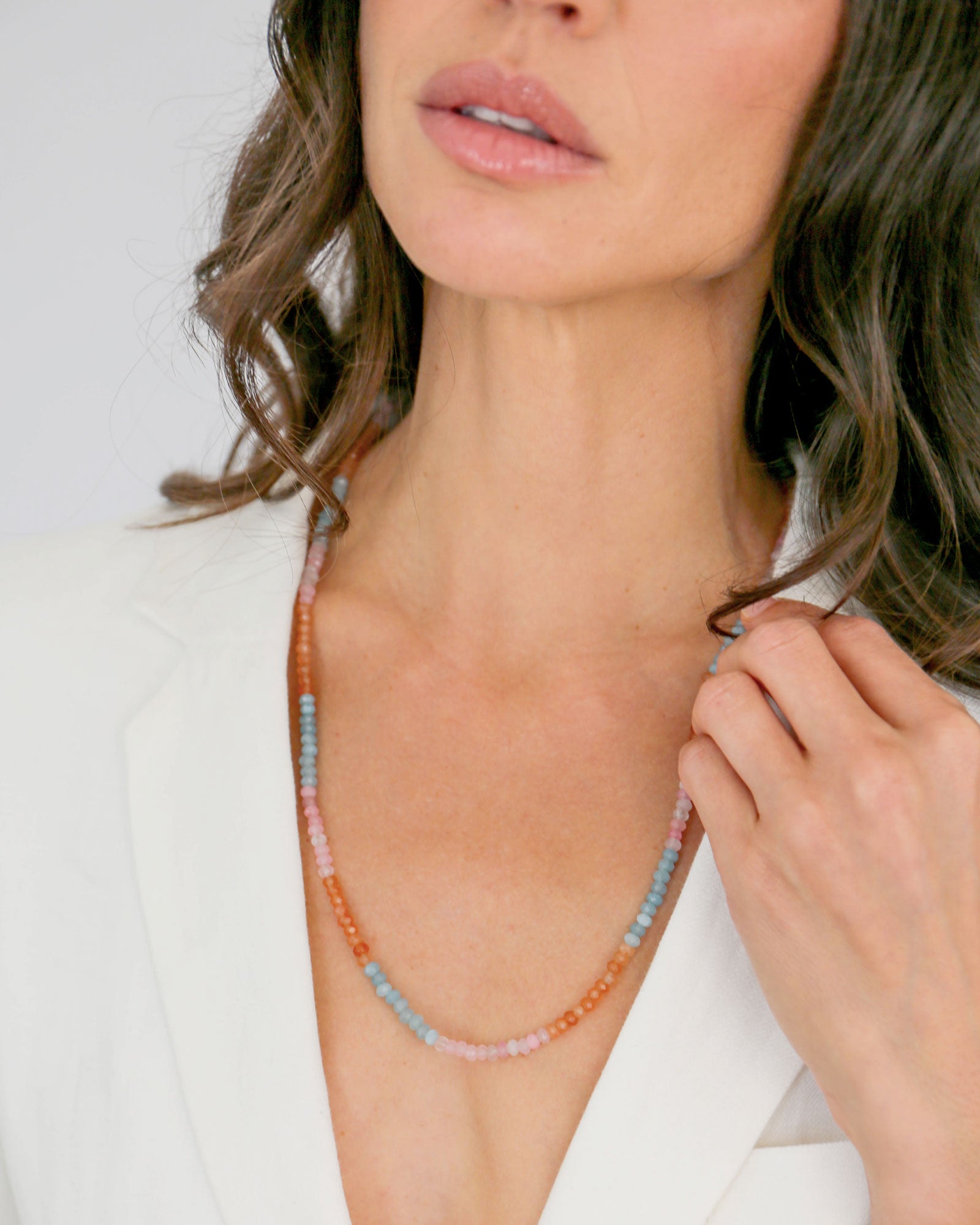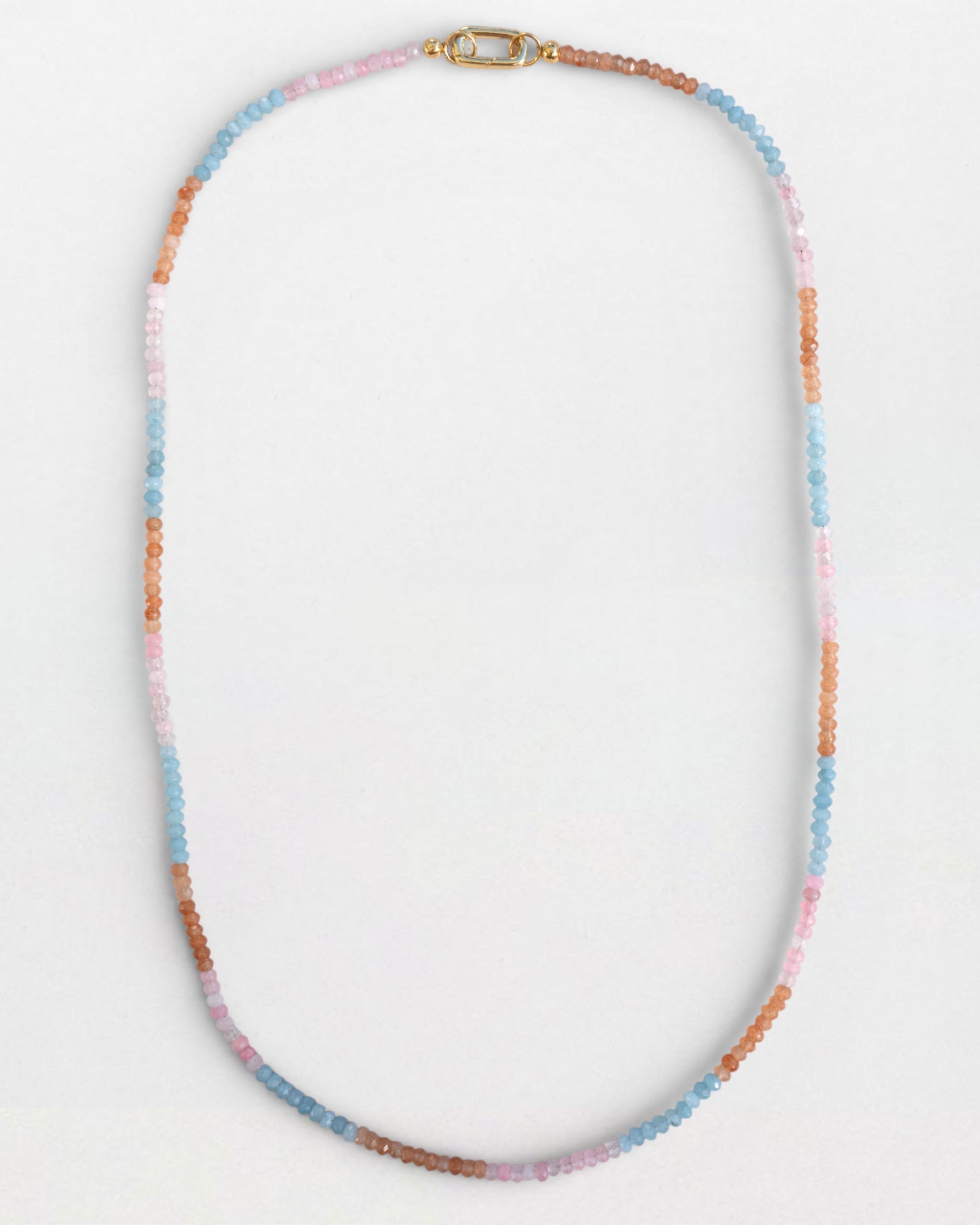 At 28 inches, this slender strand is crafted with natural white jade beads and finished with plated-gold accents, giving it a soft luminosity and a barely-there elegance. Its light, airy construction mirrors the gentle curve and subtle beauty of a floating flower petal.