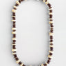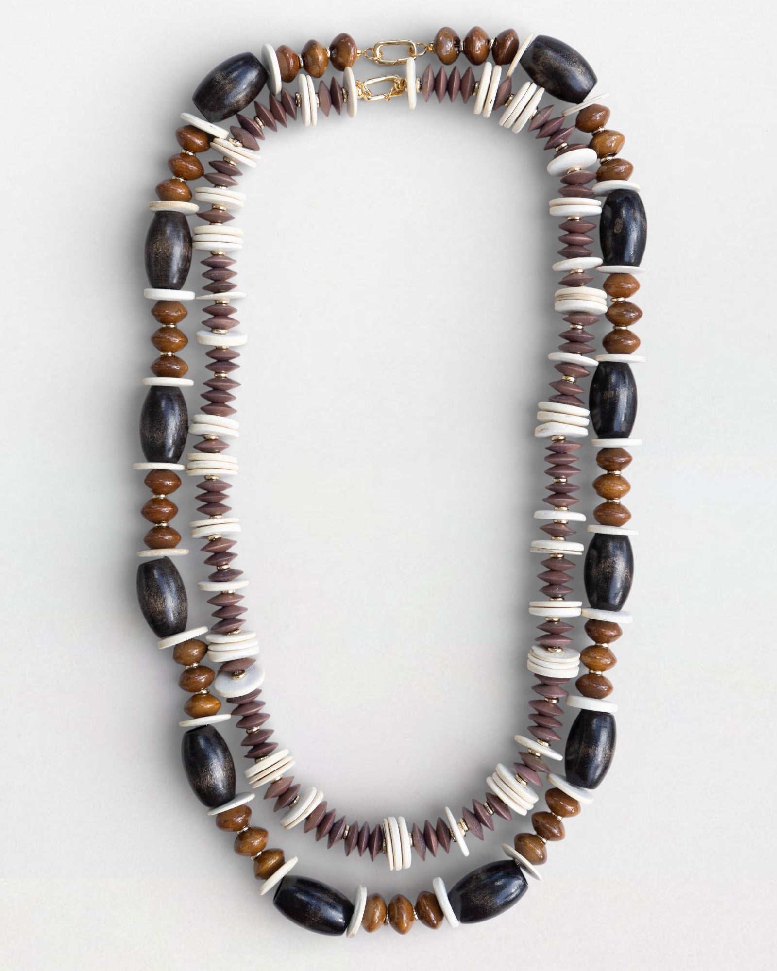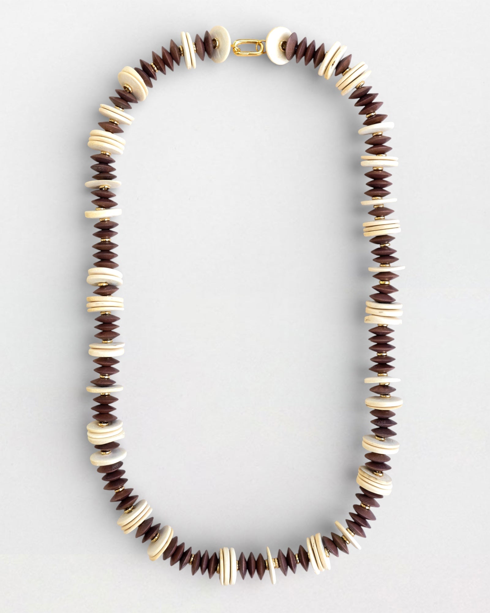At 30 inches long, this piece layers beautifully with anything, featuring a rhythmic mix of deep terracotta-toned wooden discs and smooth creamy beads that echo the warm, striated hues of iconic canyon walls and desert cliffs. Subtle gold accents add a refined touch, giving the necklace a modern balance between natural material and polished detail.