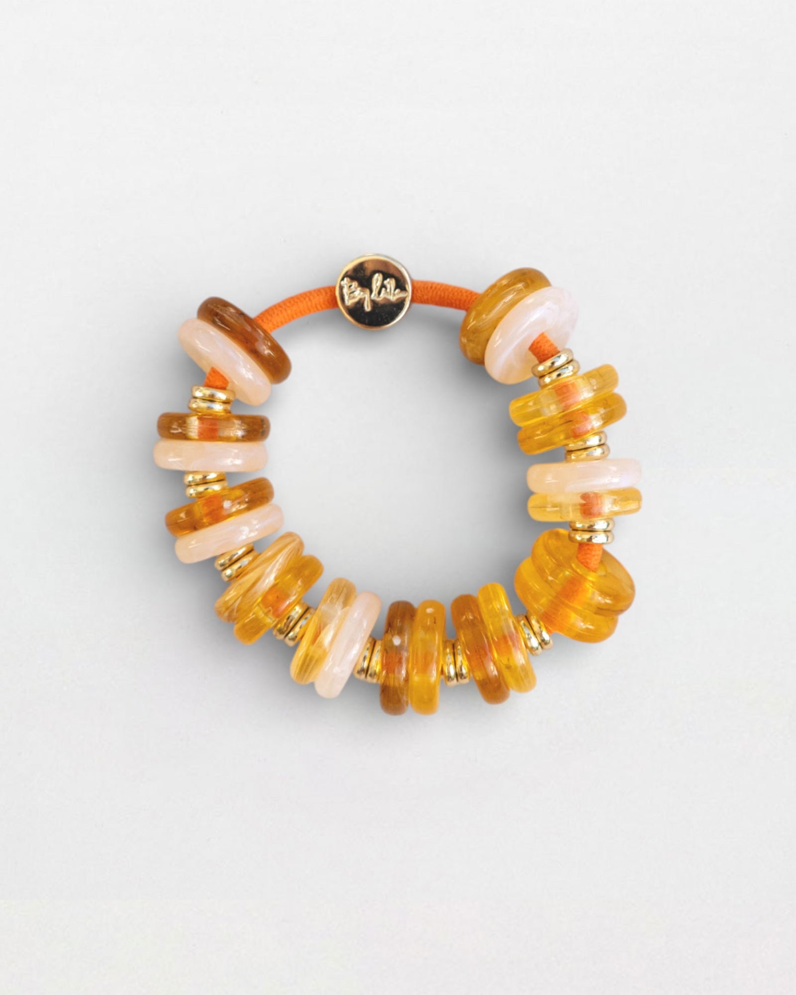 Hand-strung with translucent resin discs in honeyed ambers, soft blush tones, and sunlit yellows, this piece captures the glow and optimism of its namesake flower. Polished gold accents add a refined touch, while the vibrant elastic base keeps it playful, modern, and easy to wear.