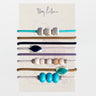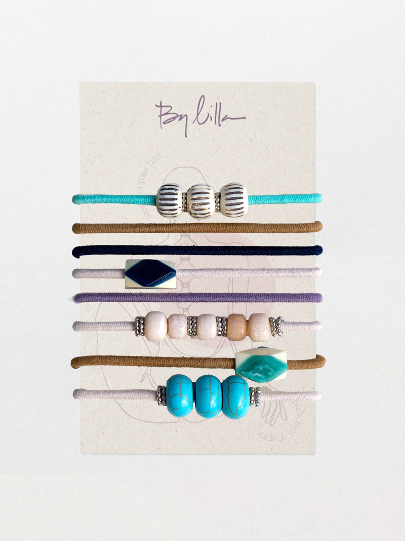 Inspired by sunlit afternoons at a seaside taverna, this eight-piece bracelet–hair tie set blends cool turquoise, inky navy, soft lavender, sandy neutrals, and crisp white beads with polished silver touches. The mix of carved textures, glossy ceramics, and organic shapes creates a relaxed, Mediterranean vibe that feels both refreshing and effortlessly stylish.
